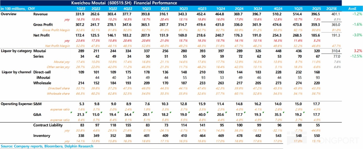 1、業績持續降速:2Q25 茅台共實現營收 396.5 億元,同比增長 7.3%,小幅不及市場一致預期(市場預期為 401 億元),核心還是在於係列酒下滑比較嚴重。從節奏上看,上半年整體營收同比增長 9.2%,如果下半年維持同樣節奏,全年 9% 的目標實現起來難度並不大。