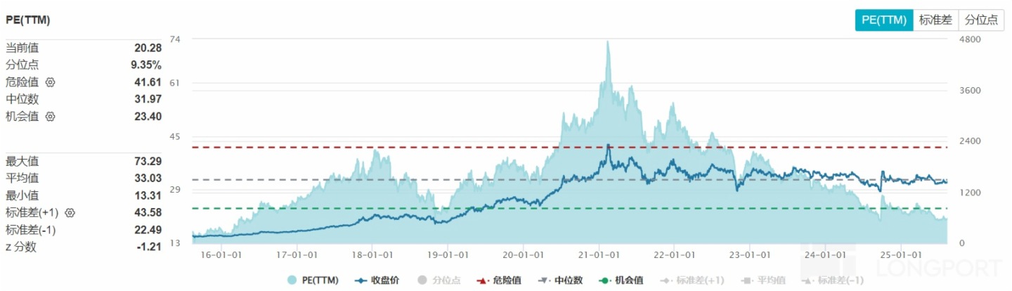 我們先來聊一下市場最關注的飛天茅台批價,一季報後,隨著 5 月 「禁酒令」 的推出,疊加電商促銷、茅台的批價擊穿 2000 元 「生死綫」,最多跌至 1830 元,創 2018 年以來新低,這也使得茅台的估值從 20x 一度回落至最低 18x 左右,隨後茅台出台了一係列強有力的控貨挺價措施後當前回升至 1900 元關口附近。