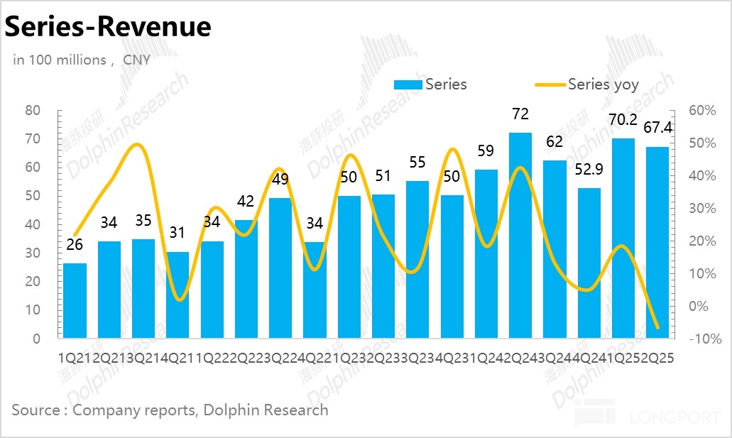 2Q25 係列酒實現營收 67 億元,同比下滑 6.6%,結合調研信息,雖然茅台 1935 通過深耕婚宴市場,配合與專精特新企業合作,目前在 700-800 元價格帶勢能強勁,是係列酒增長的主力軍,但其他産品包括王子、迎賓酒在需求疲軟、渠道庫存高企的情況下幾乎全綫下跌。