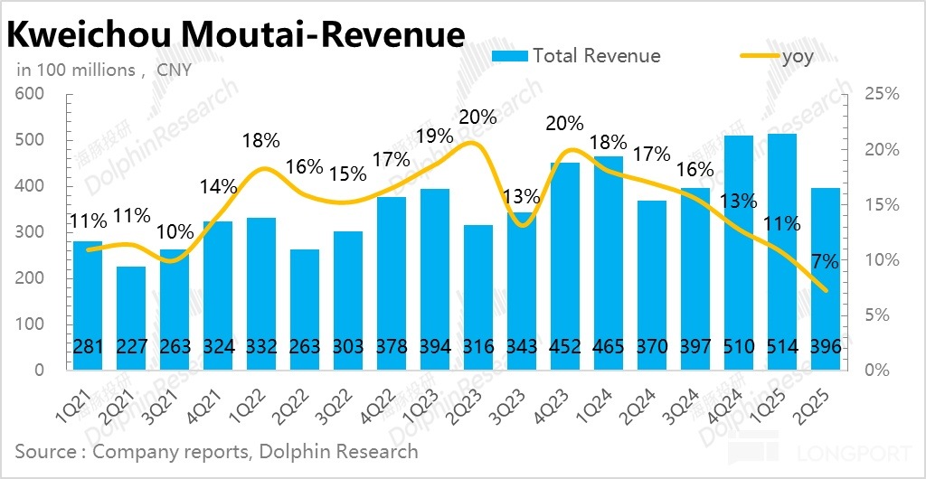 2Q25 茅台共實現營收 396.5 億元,同比增長 7.3%,小幅不及市場一致預期(市場預期為 401 億元),核心還是在於係列酒下滑比較嚴重。從節奏上看,上半年整體營收同比增長 9.2%,如果下半年維持同樣節奏,全年 9% 的目標實現起來難度並不大。