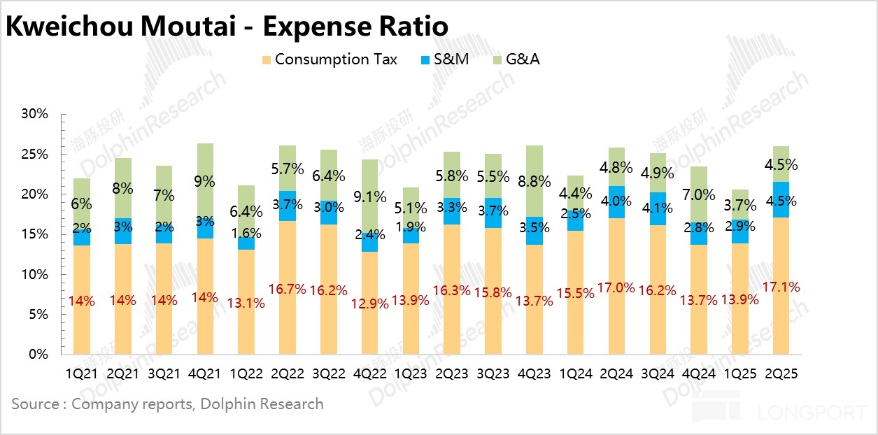 盈利方面,2Q25 茅台實現歸母淨利潤 185.6 億元,同比增長 5.2%,慢於營收端增速,主要原因在於公司加大了市場推廣費用的投放。
