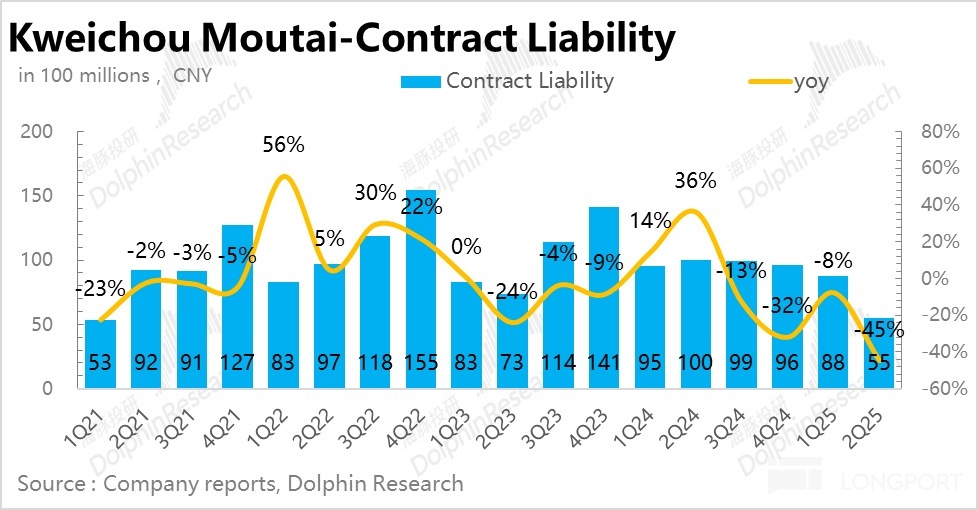 從 「蓄水池」 合同負債項看,截至二季度末茅台合同負債為 55.1 億元,同比大幅下降 45%,這也側面印證了係列酒經銷商打款意願的降低。