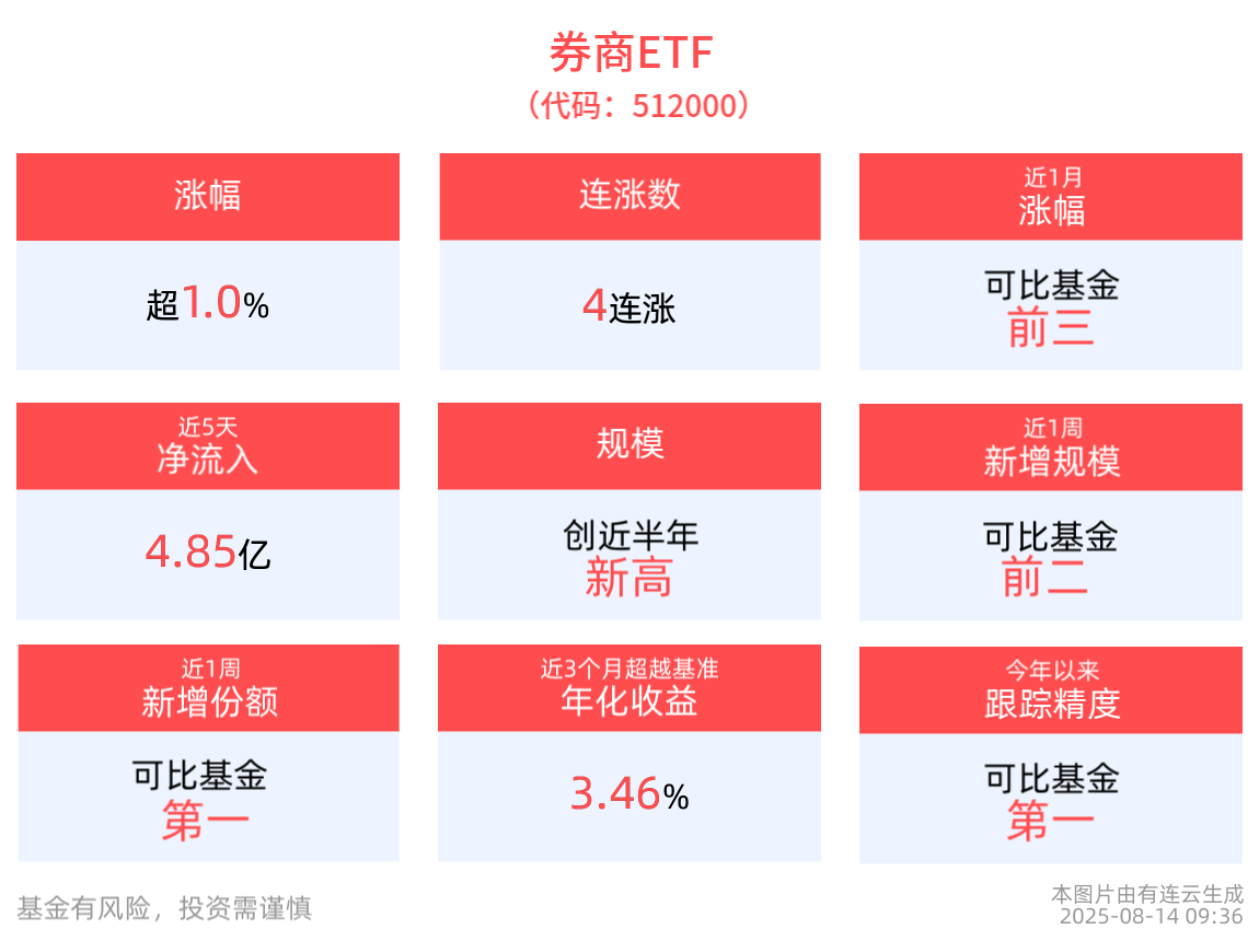 截至2025年8月14日 09:36,中證全指證券公司指數(399975)上漲0.93%,成分股長城證券(002939)上漲7.33%,華泰證券(601688)上漲3.84%,中銀證券(601696)上漲3.31%,東方證券(600958)上漲2.59%,國金證券(600109)上漲1.65%。券商ETF(512000)上漲1.01%, 沖擊4連漲。