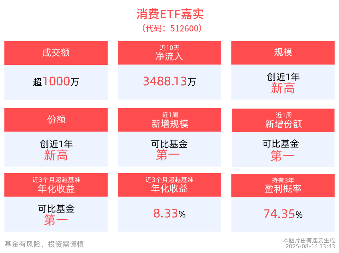 從收益能力看,截至2025年8月13日,消費ETF嘉實自成立以來,最高單月回報為24.50%,最長連漲月數為7個月,最長連漲漲幅為66.83%,上漲月份平均收益率為6.01%。截至2025年8月13日,消費ETF嘉實近3個月超越基準年化收益為8.33%,排名可比基金第一。