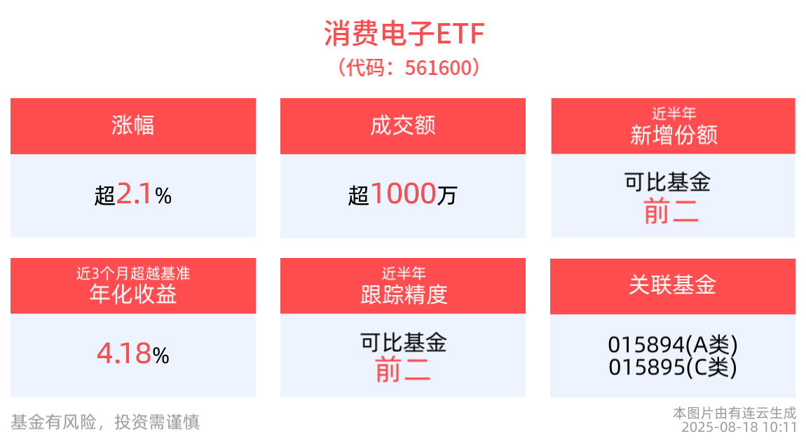 截至2025年8月18日 10:11,中證消費電子主題指數(931494)強勢上漲2.18%,成分股歌爾股份(002241)上漲8.27%,領益智造(002600)上漲7.81%,恒玄科技(688608)上漲7.38%,龍旗科技(603341),寒武紀(688256)等個股跟漲。消費電子ETF(561600)上漲2.11%,最新價報0.97元。拉長時間看,截至2025年8月15日,消費電子ETF近1周累計上漲7.48%。流動性方面,消費電子ETF盤中換手6.14%,成交1150.53萬元。