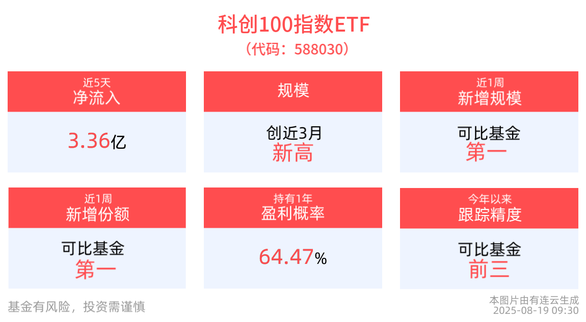 跟蹤精度方面,截至2025年8月18日,科創100指數ETF今年以來跟蹤誤差為0.020%,在可比基金中跟蹤精度較高。