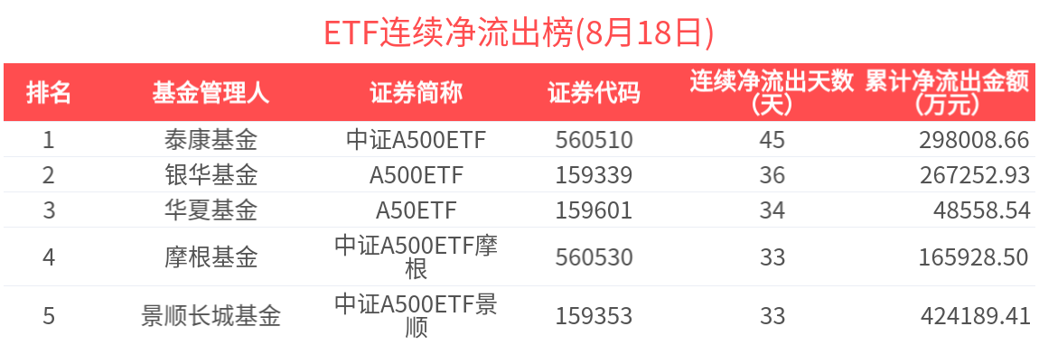 連續淨流出的ETF基金有264只,居前的為中證A500ETF(45天)、A500ETF(36天)、A50ETF(34天)、中證A500ETF摩根(33天)、中證A500ETF景順(33天),分別淨流出29.80億元、26.73億元、4.86億元、16.59億元、42.42億元。其中,A500ETF近36天加速流出,近36天累計流出26.73億元,基金規模快速下降至39.87億元。