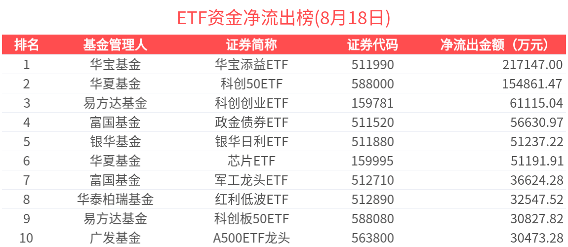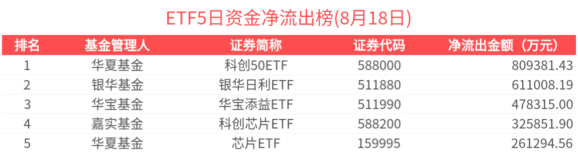 淨流出金額超1億元的有36只,華寶添益ETF(511990.SH)、科創50ETF(588000.SH)、科創創業ETF(159781.SZ)、政金債券ETF(511520.SH)、銀華日利ETF(511880.SH)資金顯著流出,分別淨流出21.71億元、15.49億元、6.11億元、5.66億元、5.12億元(淨贖回份額*單位淨值)。