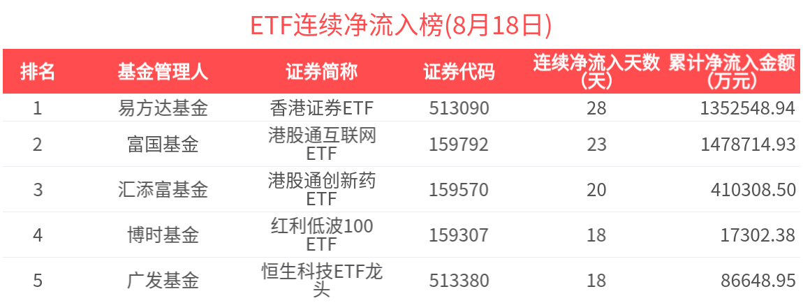 2025年8月18日共316只ETF基金獲資金淨流入,483只ETF基金淨流出。淨流入金額超1億元的有42只,30年國債ETF博時(511130.SH)、30年國債ETF(511090.SH)、券商ETF(512000.SH)、證券ETF(512880.SH)、香港證券ETF(513090.SH)資金顯著流入,分別淨流入14.93億元、12.64億元、11.41億元、11.01億元、7.56億元(淨申購份額*單位淨值)。