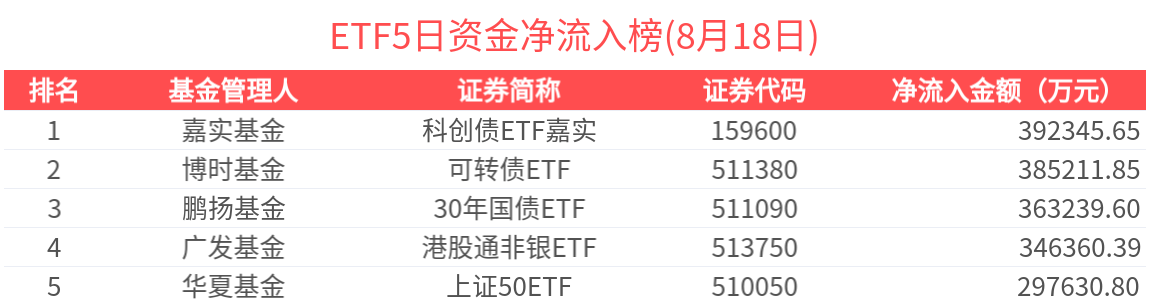 拉長時間看,近5天累計淨流入超過1億元的有106只,金額居前的為科創債ETF嘉實、可轉債ETF、30年國債ETF、港股通非銀ETF、上證50ETF等,分別淨流入39.23億元、38.52億元、36.32億元、34.64億元、29.76億元。其中,科創債ETF嘉實近5天資金大幅淨流入,基金規模快速增長至198.86億元。