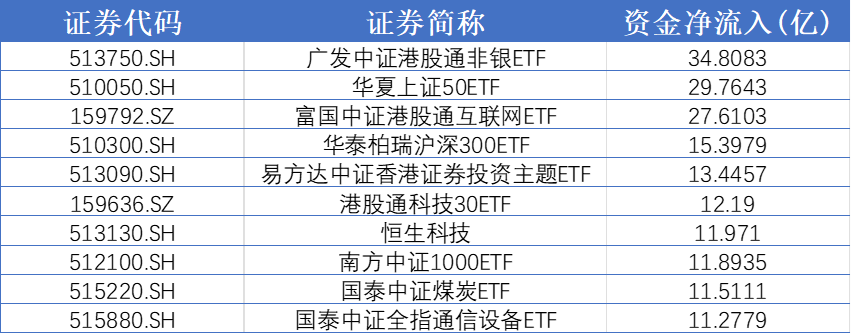 基金公司的操作,一定意义上也反应了市场风格的转变,从近1周资金流向看,与此前抱团红利,银行的价值风格不同,近期成长类风格资金流入更为明显,诸如广发中证港股通非银ETF、华夏上证50ETF总体流入量都达到了30亿级别;而富国中证港股通互联网、易方达中证香港证券投资主体ETF等也都有10亿+的流入量。