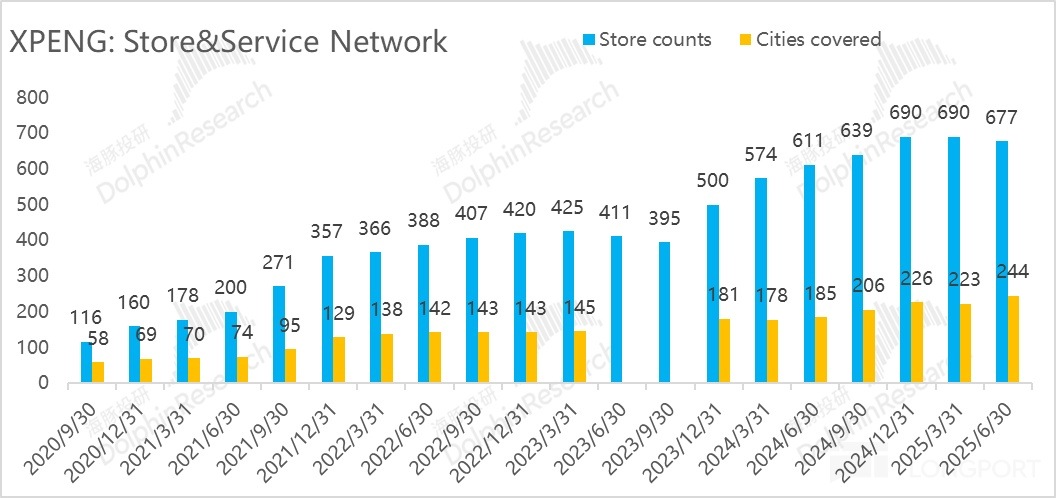 小鵬這個季度小鵬門店數環比上季度 690 家還減少了 13 家至 677 家,但覆蓋城市數淨增了 21 家至 244 家,可以看到小鵬還在做渠道變革。