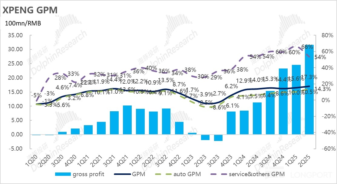 二季度,小鵬單車毛利環比上行 0.8 萬元至 2.4 萬元,也創了歷史新高!賣車毛利率也因車型結構的環比上行 + 小鵬供應鏈的持續的強降本能力,從一季度 10.5% 環比提升至二季度 14.3%。