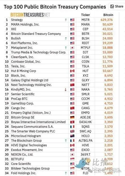 除了 MicroStrategy 和 NAKA,一個新玩家也在引發市場關注——Twenty One。它由Tether、Bitfinex、Cantor Fitzgerald和SoftBank聯合創立,初始持有 43,500 枚 BTC,按當前市價接近 50 億美元。盡管尚未正式交易,但其財團化背景,意味著比特幣國庫模式正從“單一公司押注”進入 跨行業財團聯手推動的階段。