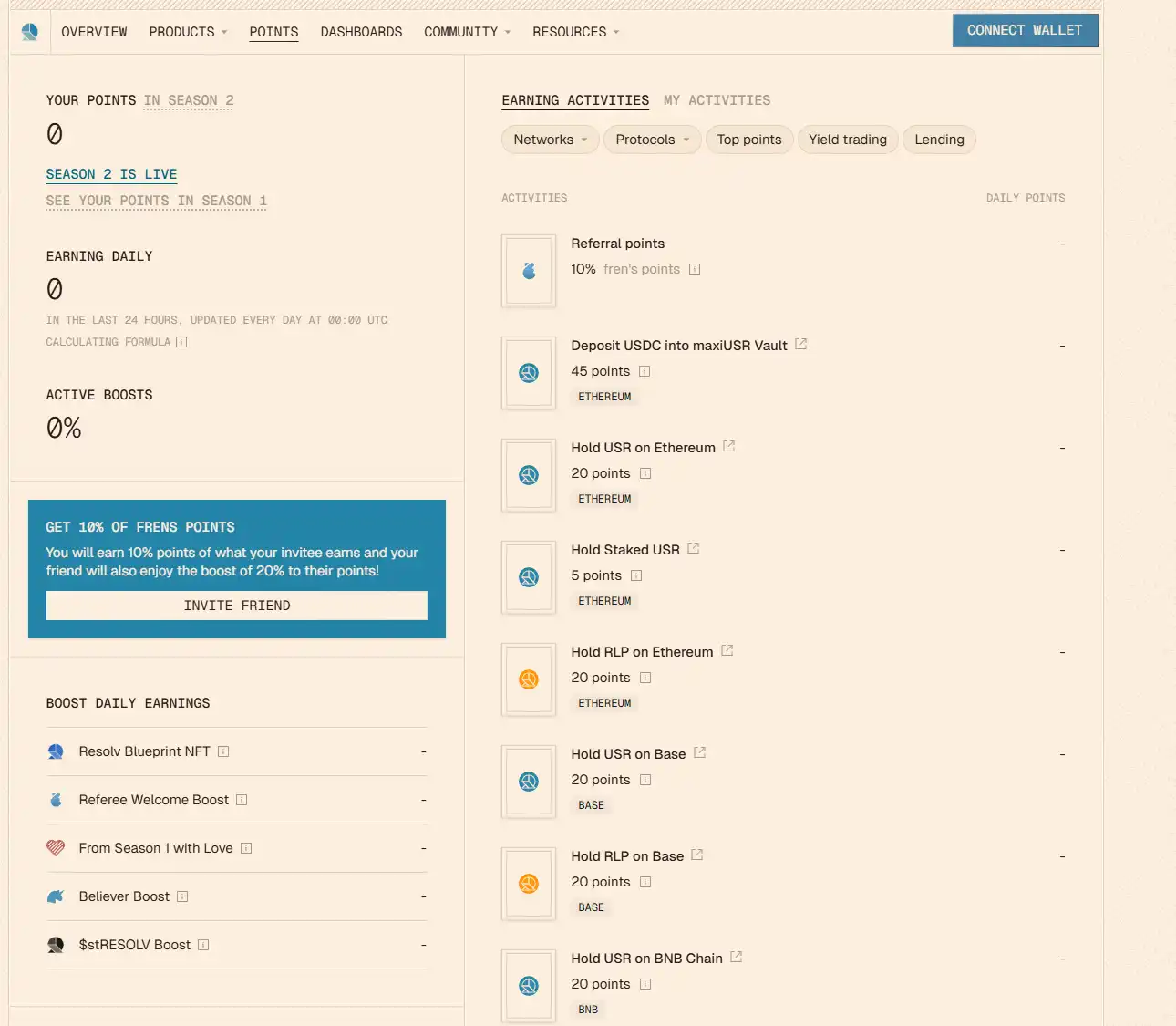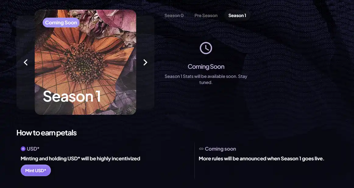 該協議有積分係統「petals」,目前已完成了前兩期活動,當前仍未開啓新一輪活動,但項目方提示獲取鑄造 $USD* 並持有將是新一輪活動的主要激勵内容。