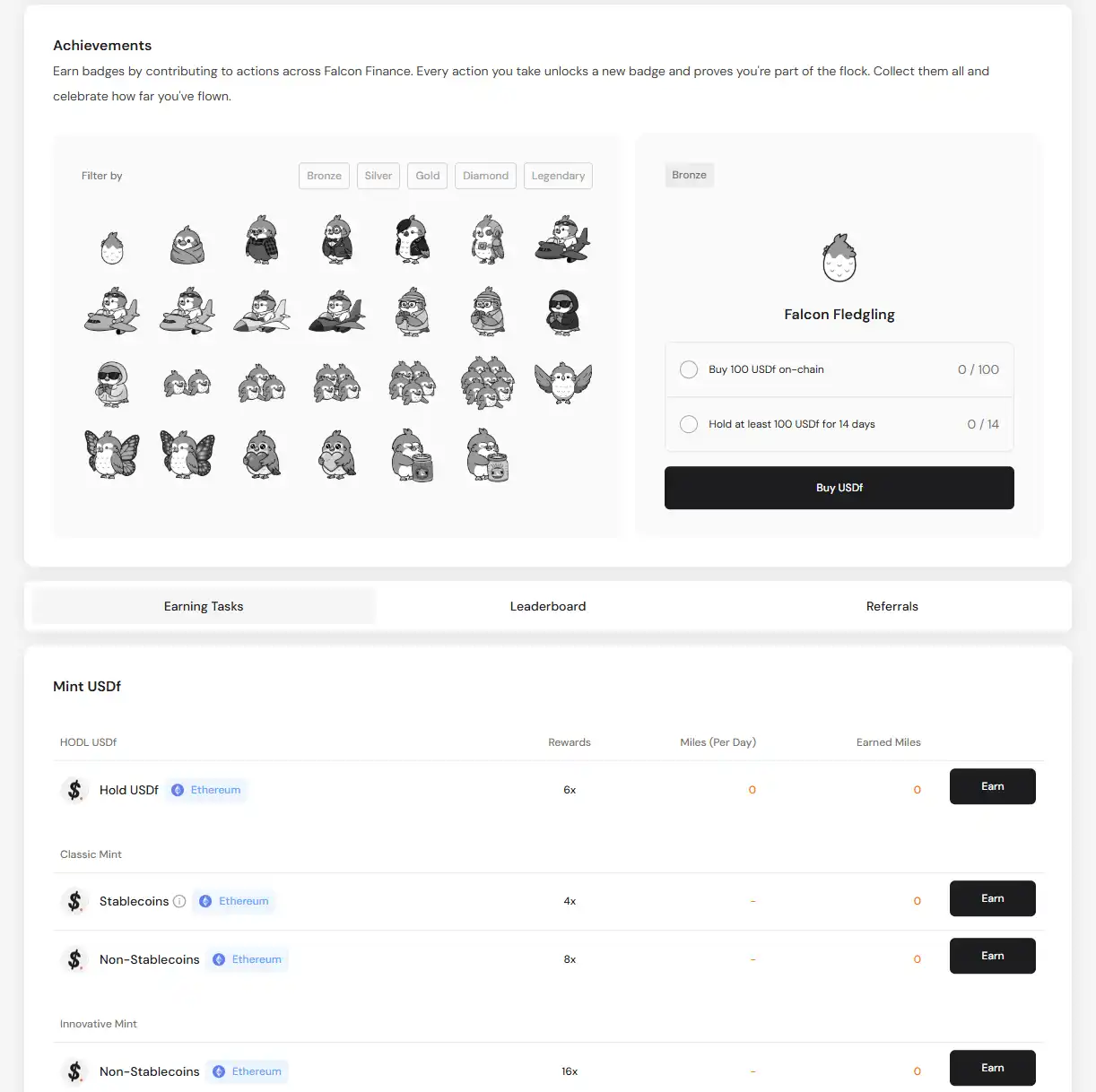 該協議有積分係統「Miles」,既可以通過參與 Falcon Finance 的各項行動來贏取徽章,也可以通過參與一係列 $USDf 與 $sUSDf 相關的活動來獲取積分。