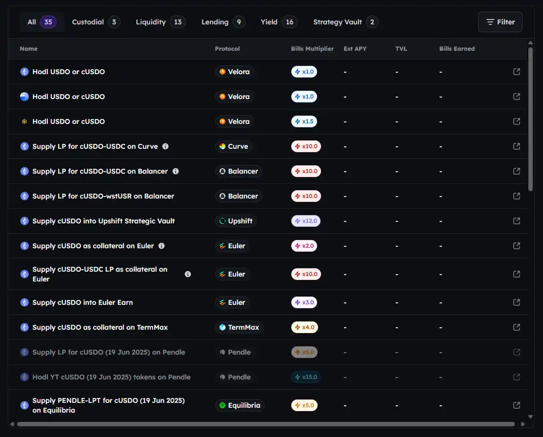 該項目獲得了 Yzi Labs 的投資,$TBILL 的 TVL 目前已接近 3 億美元。在 8 月 14 日,OpenEden 宣佈推出原生代幣 $EDEN,7.5% 的 $EDEN 將分配給「Bills」活動的參加者。通過一係列 $USDO 與 $cUSDO 相關的活動可獲得 Bills 積分。