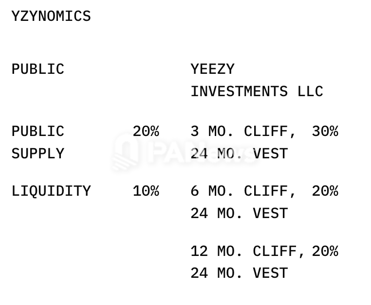 YZY代幣總供應量中,20%分配給公眾,10%用於流動性,Yeezy Investments LLC獲得50%份額,分為三檔鎖定:30%三個月後解鎖,20%六個月後解鎖,20%十二個月後解鎖,均採用24個月綫性釋放機制。