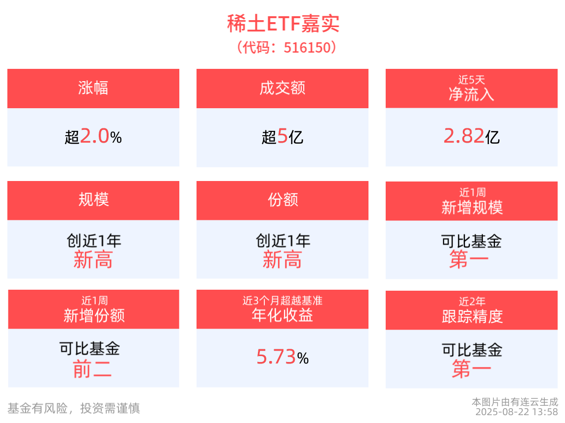 截至2025年8月22日 13:58,中證稀土産業指數強勢上漲2.10%,成分股三川智慧20cm漲停,北方稀土上漲7.33%,奔朗新材上漲4.17%,中科磁業、雲路股份等個股跟漲。稀土ETF嘉實(516150)上漲2.01%。拉長時間看,截至2025年8月21日,稀土ETF嘉實近1周累計上漲9.48%。