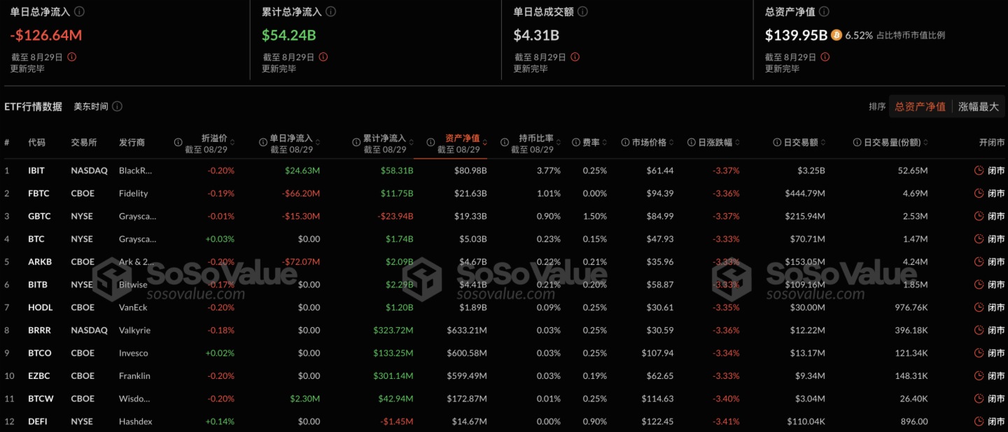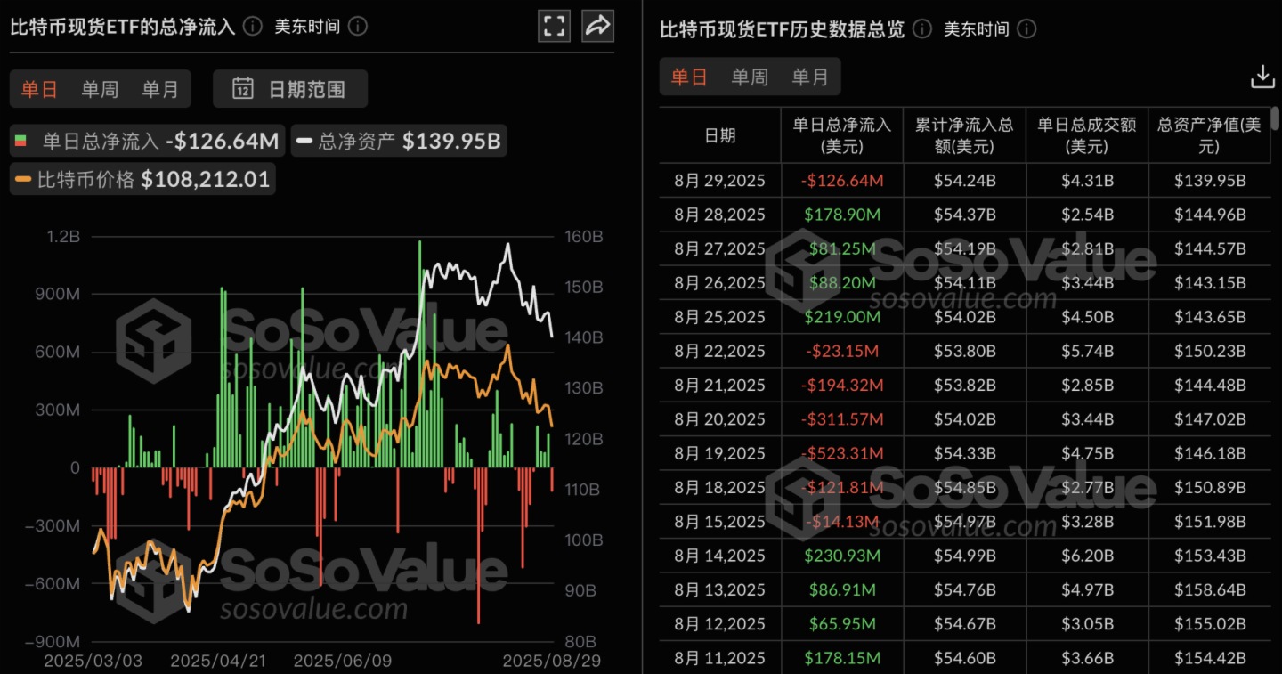 PANews 8月30日消息,根據 SoSoValue 數據,昨日(美東時間 8 月 29 日)比特幣現貨 ETF 總淨流出 1.27 億美元。