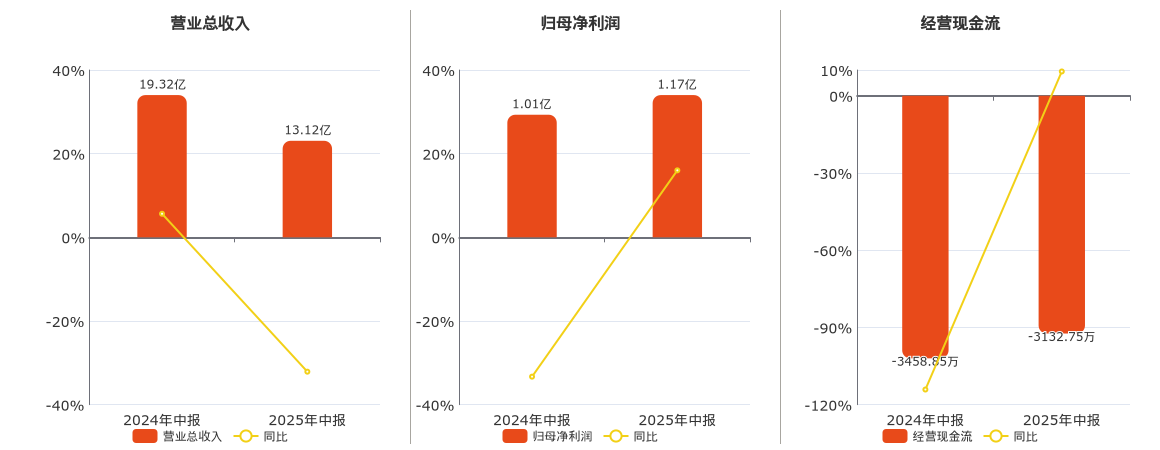 公司營業總收入為13.12億元,在已披露的同業公司中排名第54。歸母淨利潤為1.17億元,在已披露的同業公司中排名第40,較去年同報告期歸母淨利潤增加1619.44萬元,同比較去年同期上漲16.01%。經營活動現金淨流入為-3132.75萬元,較去年同報告期經營活動現金淨流入增加326.10萬元。