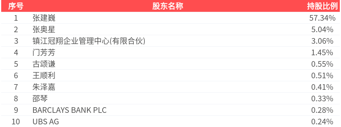 公司股東戶數為1.36萬戶,前十大股東持股數量為5084.40萬股,佔總股本比例為69.19%,前十大股東持股情況如下: