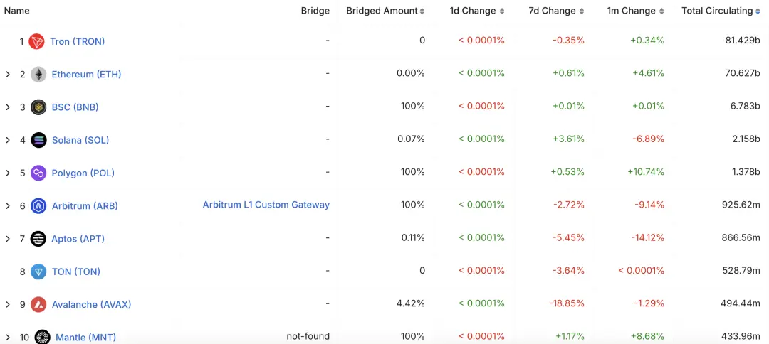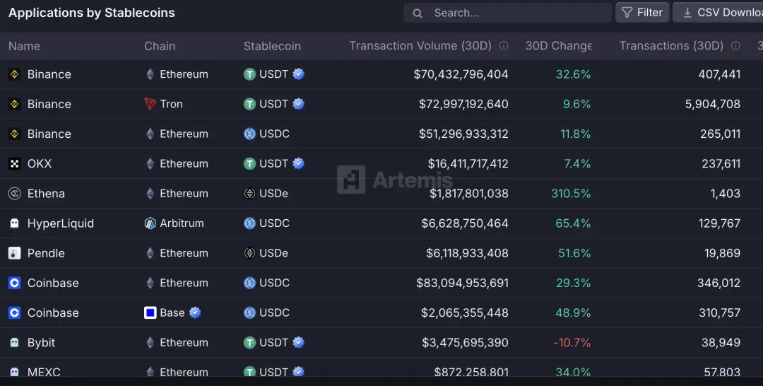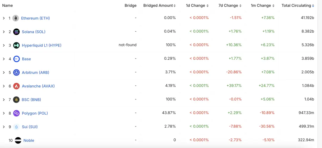 近30天USDC在 AVAX 鏈和 HYPE 出現較為顯著的增幅,分別為25%,6%,主要由鏈上DeFI和交易所需求導致。
