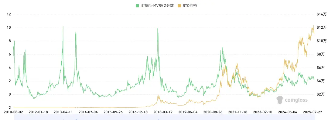 長期趨勢指標 MVRV-ZScore 以市場總成本作為依據,反映市場總體盈利狀態。當指標大於6時,是頂部區間;當指標小於2時,是底部區間。MVRV跌破關鍵水平1,持有者總體上處於虧損狀態。當前指標為2.5,接近中部區間。