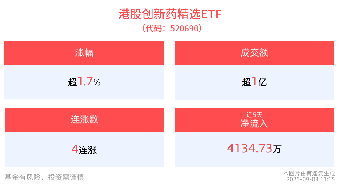 截至2025年9月3日 11:15,恒生港股通創新藥精選指數強勢上漲1.19%,成分股藥明合聯上漲6.04%,諾誠健華上漲5.49%,聯邦制藥上漲5.11%,石藥集團,先聲藥業等個股跟漲。港股創新藥精選ETF(520690)上漲1.80%, 沖擊4連漲。最新價報1.08元。拉長時間看,截至2025年9月2日,港股創新藥精選ETF近1周累計上漲3.12%。