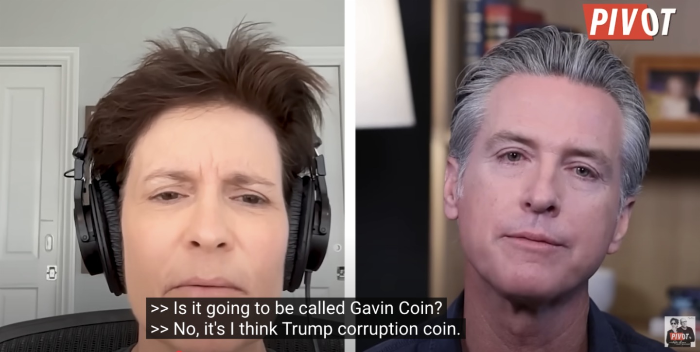 近日,紐森在由科技記者 Kara Swisher 與紐約大學教授 Scott Galloway 主持的播客節目 Pivot 中表示計劃發行「特朗普腐敗幣(Trump Corruption Coin)」以諷刺特朗普利用加密貨幣濟私的行為。