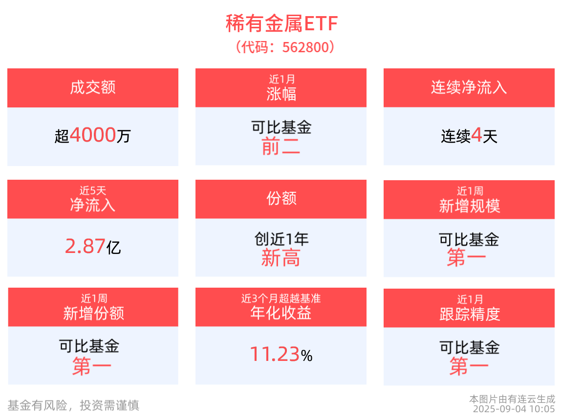 規模方面,稀有金屬ETF近1周規模增長2.91億元,實現顯著增長,新增規模位居可比基金第一。份額方面,稀有金屬ETF最新份額達29.52億份,創成立以來新高,位居可比基金第一。從資金淨流入方面來看,稀有金屬ETF近4天獲得連續資金淨流入,最高單日獲得1.16億元淨流入,合計「吸金」3.04億元。