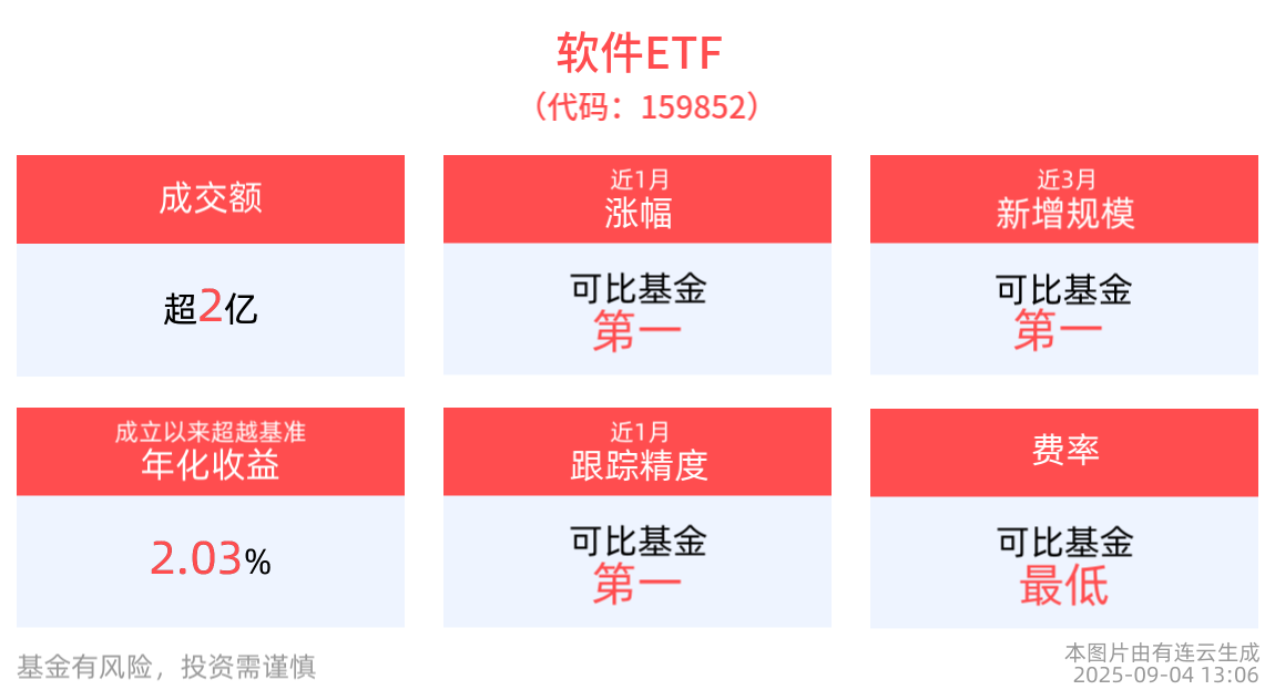 截至9月3日,軟件ETF近3年淨值上漲20.31%。從收益能力看,截至2025年9月3日,軟件ETF自成立以來,最高單月回報為39.35%,最長連漲月數為3個月,最長連漲漲幅為69.40%,上漲月份平均收益率為10.06%。