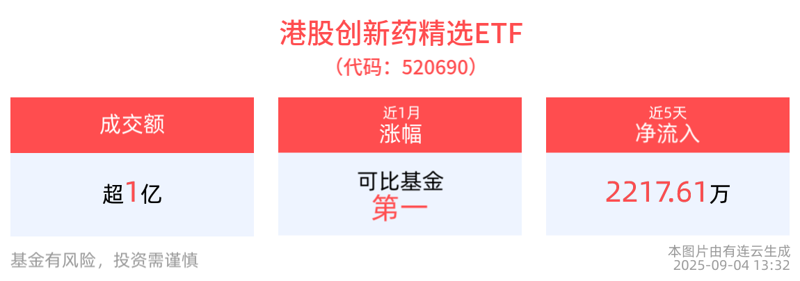 流動性方面,港股創新藥精選ETF盤中換手41.6%,成交1.51億元,市場交投活躍。拉長時間看,截至9月3日,港股創新藥精選ETF近1周日均成交2.17億元。