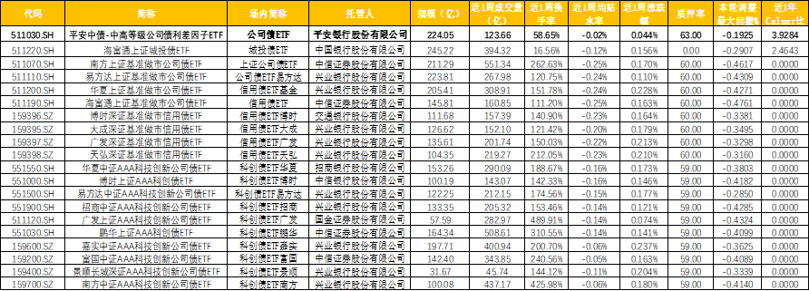 本周繼續關注本輪債市調整以來平安公司債ETF(511030)回撤控制排名第一,上周場内成交貼水最少,淨值相對穩健且回撤可控,可參考下表(本輪債市調整自2025年8月8日起算):