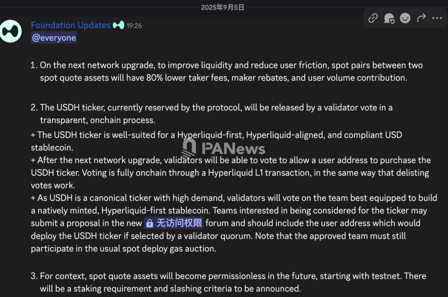 PANews 9月5日消息,Hyperliquid Foundation發佈更新消息稱,下次網絡升級將對現貨交易做出優化:兩種現貨計價資産之間的交易對,吃單費率將下調80%,並增加掛單返佣與用戶交易量貢獻。同時,協議此前保留的USDH交易對代碼將通過鏈上驗證人投票決定釋放。消息指出,USDH將作為Hyperliquid原生合規USD穩定幣的優先選擇,未來由驗證人投票選出的團隊部署。申請團隊需提交提案並提供部署地址,最終仍需參與現貨部署的Gas拍賣。官方同時表示,現貨計價資産將在未來逐步實現無需許可,相關質押與懲罰機制將於後續公佈。