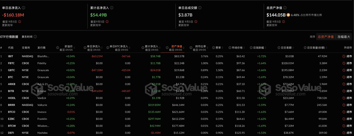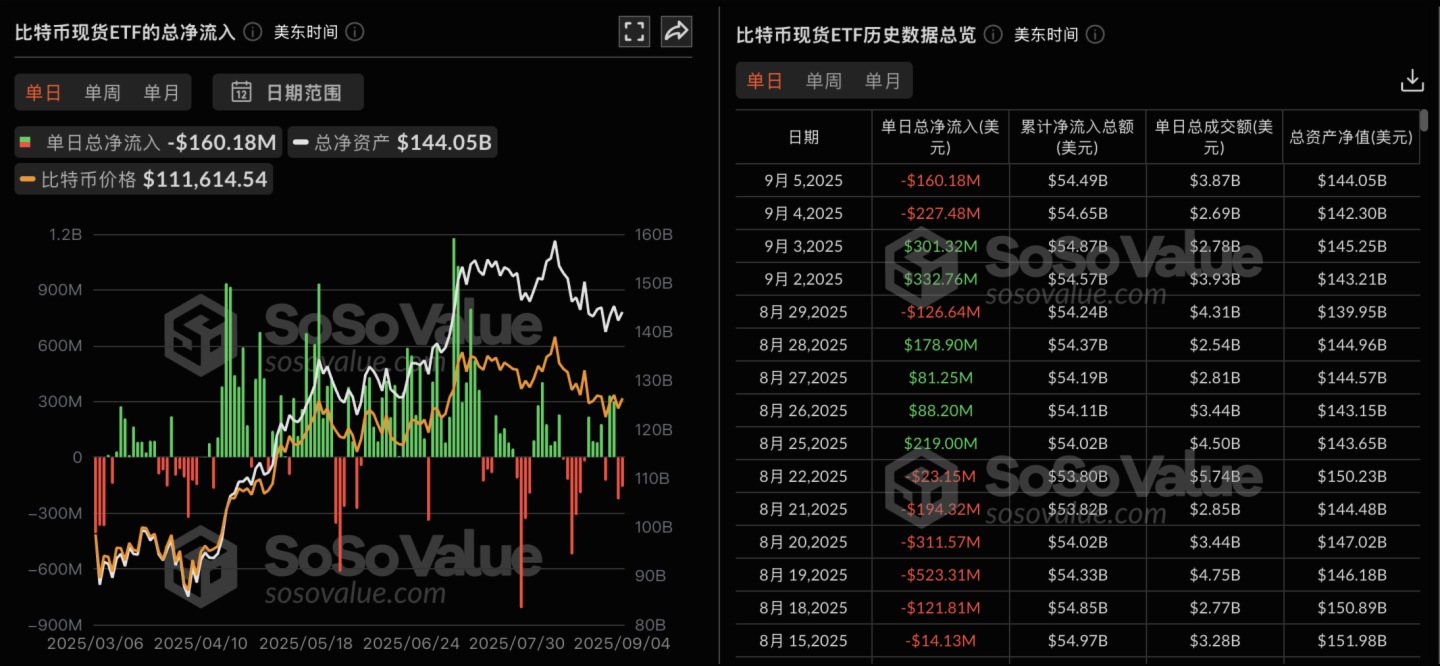 PANews 9月6日消息,根據 SoSoValue 數據,昨日(美東時間 9 月 5 日)比特幣現貨 ETF 總淨流出 1.60 億美元。