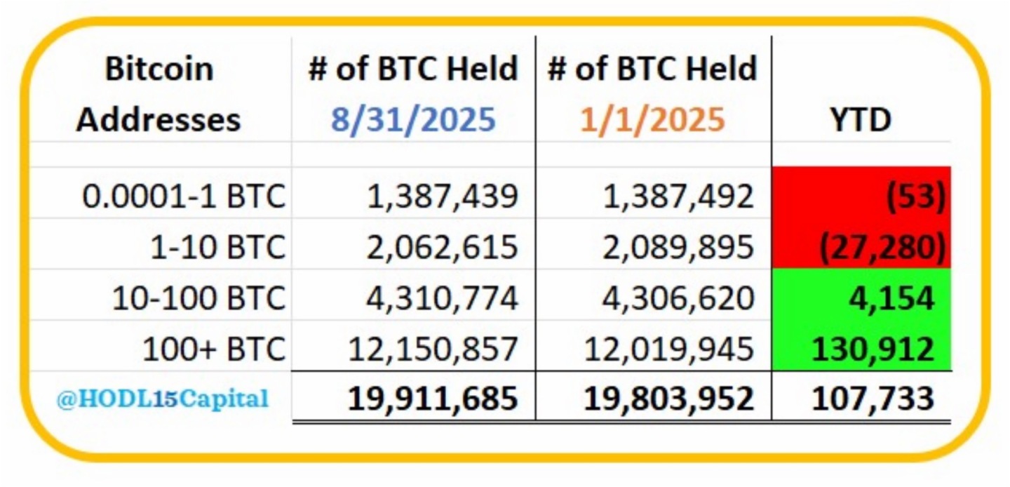 PANews 9月7日消息,據 HODL15Capital 監測,年初至今已挖出 107,733 枚 BTC。持有 10 枚 BTC 或以下的地址售出了 27,333 枚;持有 10 至 100 枚 BTC 的地址增持 4,154 枚;持有 100 枚以上 BTC 的巨鯨地址增持 130,912 枚(相當於買入 100% 的新開採 BTC 以及額外的 23,179 枚 BTC)。