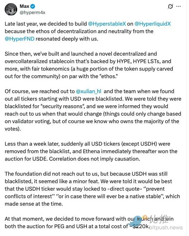 該生態的老牌穩定幣協議 Hyperstable 的開發者 Max 率先發聲。他指出,過去 USDH 代號曾被黑名單化,迫使他們只能啓用“USH”作為穩定幣符號。如今,基金會突然解封 USDH,讓 Hyperstable 感到規則被臨時修改,“對已經投入大量資源的團隊極不公平”。