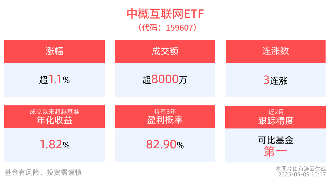 截至2025年9月9日 10:17,中概互聯網ETF(159607)上漲1.12%, 沖擊3連漲。成分股方面,阿裡健康漲超5%,網易-S、快手-W漲超4%,阿裡巴巴-W、京東集團-SW等跟漲。