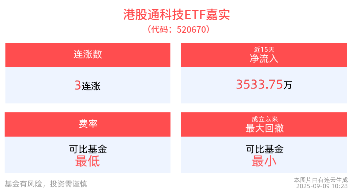 截至2025年9月9日 10:28,港股通科技ETF嘉實(520670)上漲0.88%, 沖擊3連漲。成分股方面,快手-W漲超4%,中芯國際漲超3%,阿裡巴巴-W、華虹半導體等跟漲。