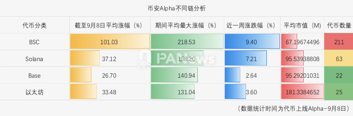 PANews 9月12日消息,數據顯示,發行公鏈對幣安Alpha代幣的市場表現有顯著影響。其中,BSC鏈(BNB Smart Chain)上的211個代幣自上綫以來平均漲幅達到101%,表現最佳。相比之下,Solana鏈代幣平均漲幅為37%,以太坊鏈為33.4%,Base鏈為26%。