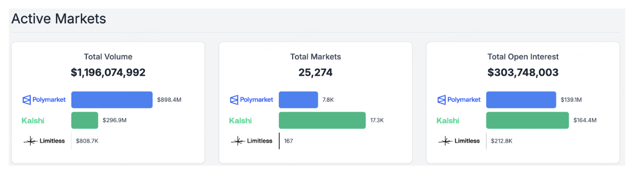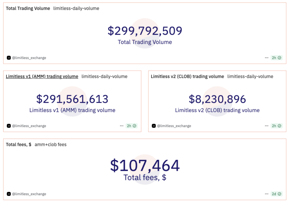 截至目前,Limitless累計交易量約 2.99 億美元,其中V1貢獻約2.91億美元,V2約823萬美元,總手續費約10.7萬美元。2025年7月,Limitless完成400萬美元戰略融資,由 Coinbase Ventures、1confirmation 等機構參與,目前是Base鏈上最大的預測市場。