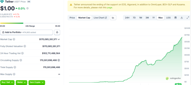 PANews 9月13日消息,據Coingecko最新數據顯示,穩定幣發行商Tether推出的美元穩定幣USDT市值已突破1700億美元,當前觸及170,085,261,371美元,續創歷史新高,過去24小時交易額達到102,711,488,564美元。