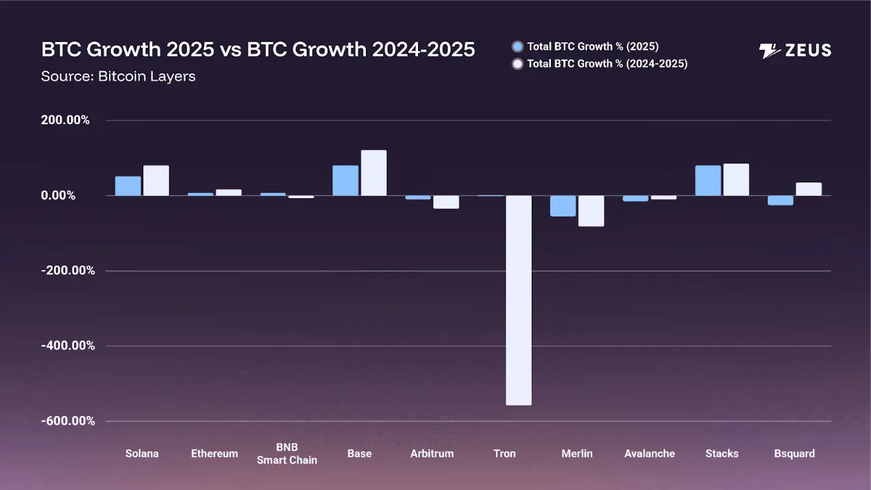 《鏈上比特幣經濟報告》顯示,表現排名前四的區塊鏈(Base、以太坊、Stacks、Solana)在 2025 年的增長量超過 2.6 萬枚 BTC,而排名墊底的五條區塊鏈則總共損失了超過 8,000 枚 BTC。