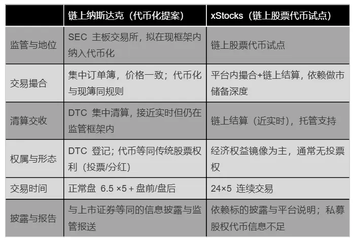 聯盟鏈允許參與方經過準入控制,數據隱私和交易速度都更可控,符合監管要求。因此,可以預見納斯達克代幣化股票的記錄不會出現在公共區塊鏈浏覽器上,而是保存在由納斯達克、DTC 及相關託管機構共同維護的分佈式賬本中。至於具體的智能合約如何部署,納斯達克未在公開文件中指明,但可以看到納斯達克不打算引入一個完全開放的代幣交易環境,而是讓區塊鏈作為 “幕後技術” 提升效率,前端的交易行為依然發生在受控體係内。只是在記賬方式上改用區塊鏈記錄,即投資者持有的將是受監管機構認可的鏈上記錄,而非完全脫離傳統體係自由流通的加密代幣。