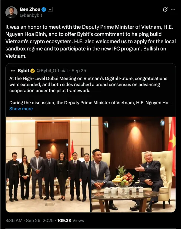 Bybit同样攻势凌厉。2025年9月17日,它与岘港人民委员会、阿布扎比区块链中心及Verichains共同签署三方备忘录,合作涵盖流动性供给、基础设施安全及生态联通,精准契合越南监管目标。虽未达币安的高层会晤级别,但为其参与国际金融中心建设奠定实操基础。