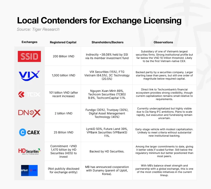 其次,机构锚定将决定谁能存活。决议要求至少65%的机构所有权,包括至少两家银行、证券公司、保险公司或技术企业的35%份额。这一条款明显有利于已经与SSI、VIX、Techcom、HD和MB等主要金融机构有联系的参与者,而让DNEX或CAEX等金融科技主导的载体处于劣势,除非他们能够吸引更强大的合作伙伴。
