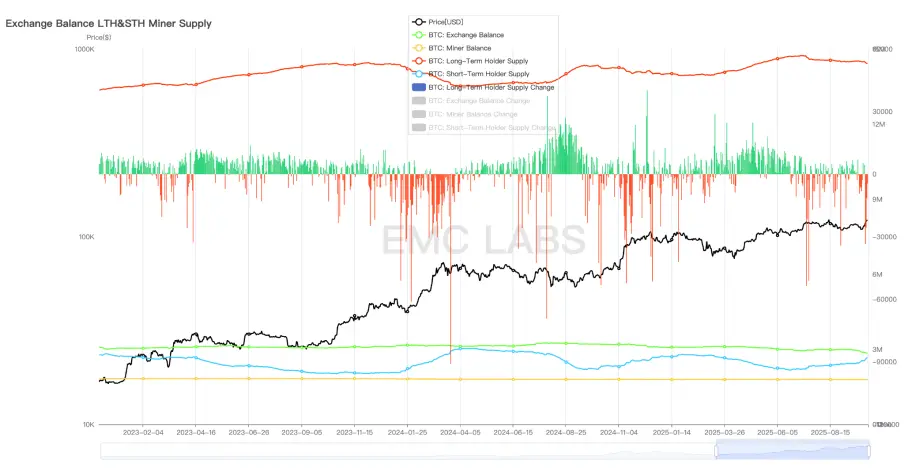 在這一階段及之後,這種流出仍在持續,它顯示出BTC這一資産目前正處於歷史性的換手之中。早期投資者(包括7年以上的持有群體)正在兌現巨額利潤退場,而傳統資金正在轉變為這一資産的長期投資者。早期投資者的行為受減半周期影響非常大,而DATs公司似乎傾向於持續買入長期持有,BTC Spot ETF通道的持有者行為則受美股走勢影響更大。