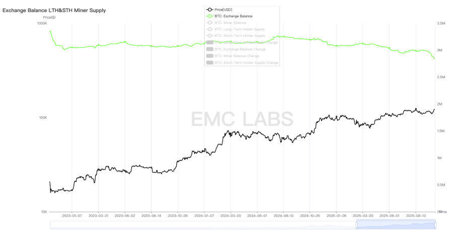 伴隨BTC Spot ETF和DATs公司的大規模介入,BTC迎來一個大換手時代。大量BTC正從早期持有者轉入BTC Spot ETF和DATs公司的託管賬戶。這使得早期Crypto持有者慣常使用的中心化交易所持有的BTC在本階段開始大幅下滑。截止2025年9月底,超過40萬枚BTC流出了中心化交易所的管理地址,以10萬美元計,價值超過400億美元。