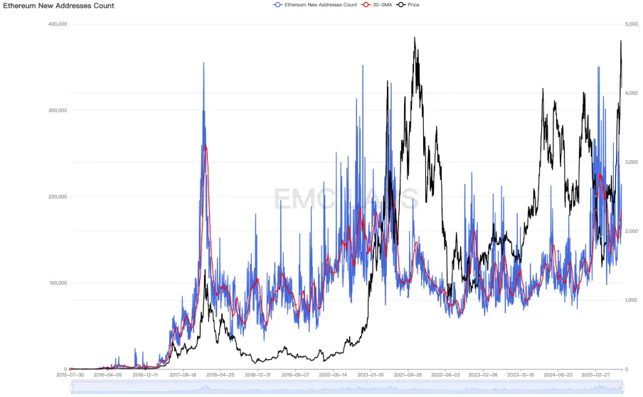 但當觀察最大的SCP平台Ethereum時,我們可以注意到本周期新增地址出現了相同的情形。
